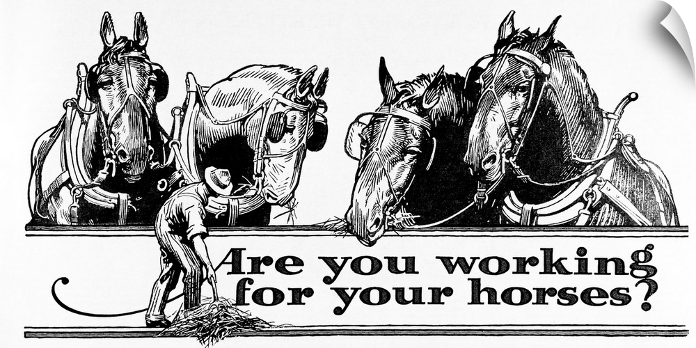 <p>Advertisement with illustration of farmer and horses in early 20th century.</p>