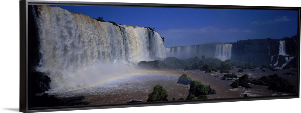 <p>This is a panoramic photograph of enormous South American waterfalls and a rainbow forming under the cascades.</p>
