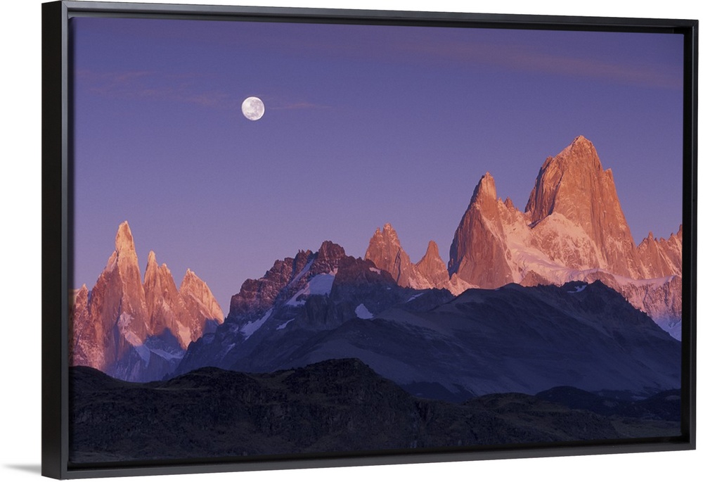<p>South America, Argentina, Patagonia, Parque Nacional los Glaciares. Moon over Cerro Torre and Cerro Fitz Roy at sunrise.</p>