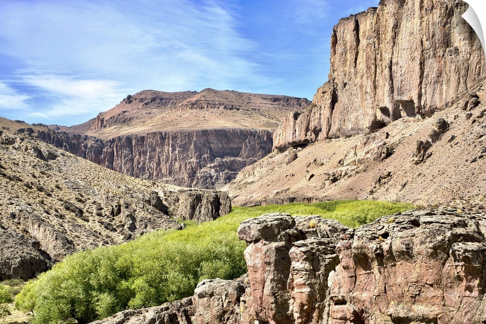 <p>Argentina, Santa Cruz, Valle Del Rio Pinturas - Pinturas River Valley; Cueva De Las Manos - Cave Of The Hands Is On The Right Side Of The Mountain, Just Below The Vertical Cliff</p>