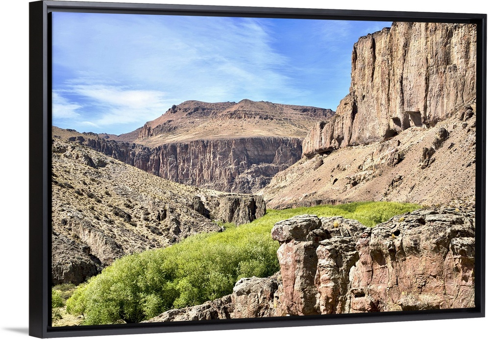 <p>Argentina, Santa Cruz, Valle Del Rio Pinturas - Pinturas River Valley; Cueva De Las Manos - Cave Of The Hands Is On The Right Side Of The Mountain, Just Below The Vertical Cliff</p>