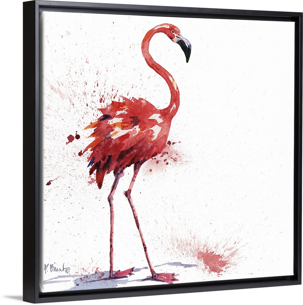 <p>Square watercolor painting of a flamingo on a white background with pink paint splatter.</p>