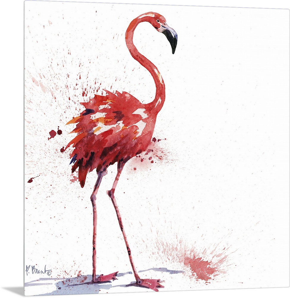 <p>Square watercolor painting of a flamingo on a white background with pink paint splatter.</p>