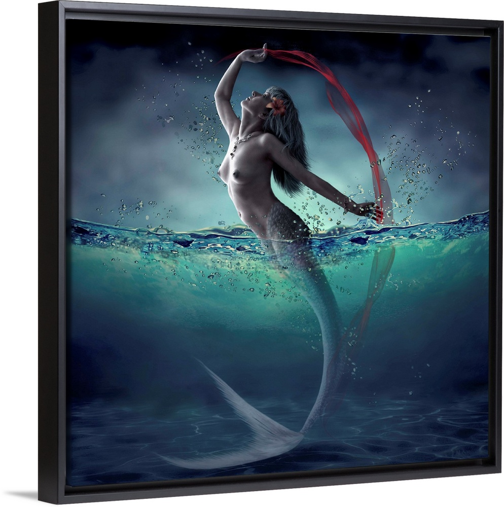 <p>Fantasy image of a mermaid leaping out of the water with a red veil.</p>