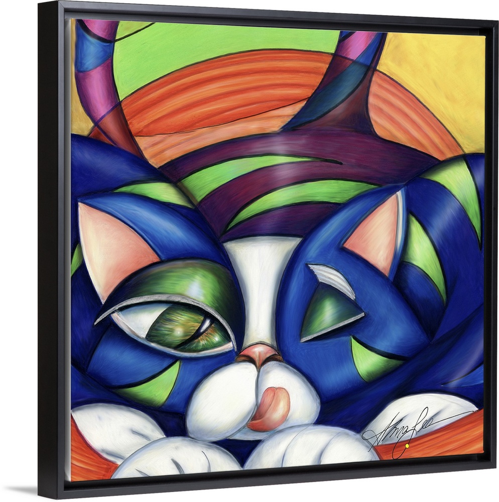 <p>Contemporary artwork in the style of cubism of a crouching cat in bold colors.</p>