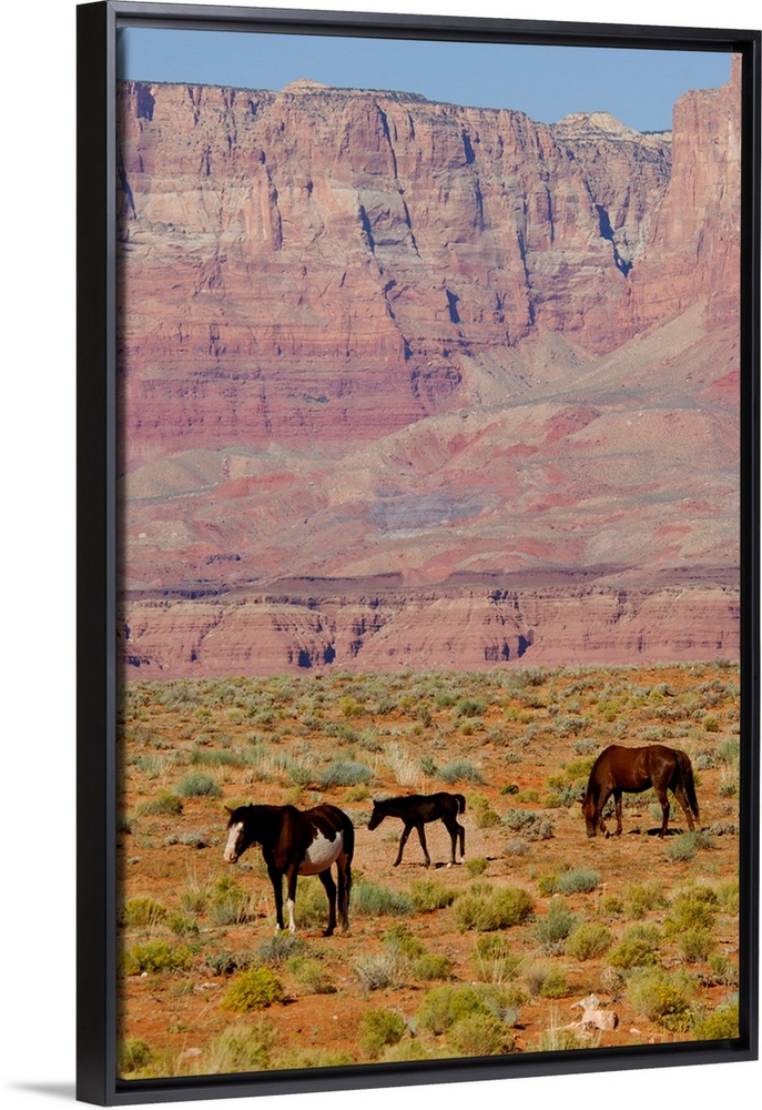 <p>North America, USA, Arizona, Grand Canyon National Park, North Rim. Vermilion Cliffs National Monument. Herd of horses in front of famous red cliffs seen on the way to the North Rim.</p>
