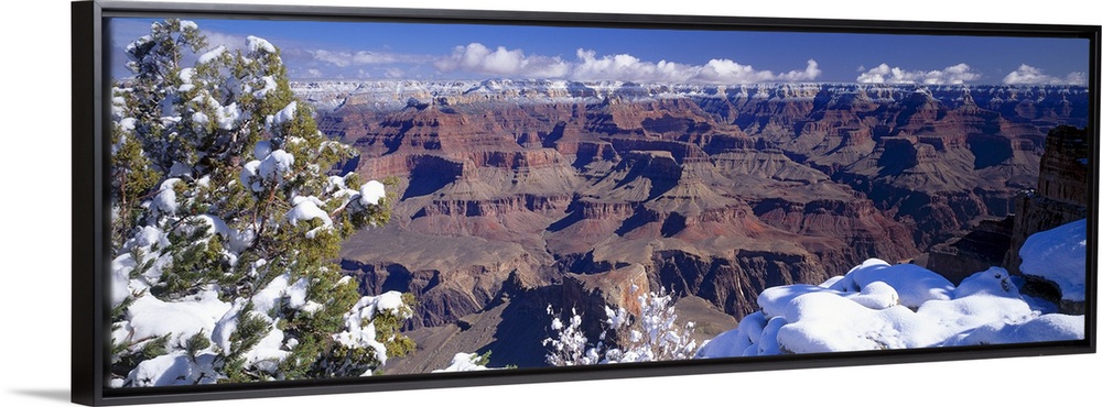 <p>A panoramic view of the snow caps of the Grand Canyon in winter, with a snow-covered tree in the foreground.</p>
