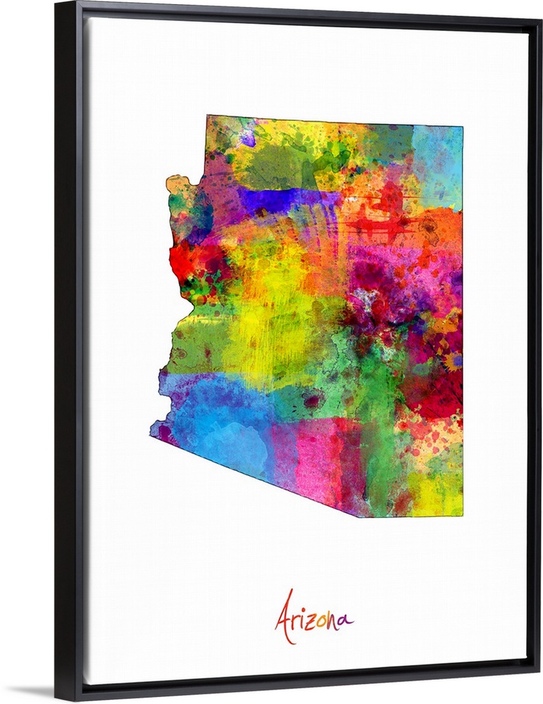 <p>Contemporary artwork of a map of Arizona made of colorful paint splashes.</p>