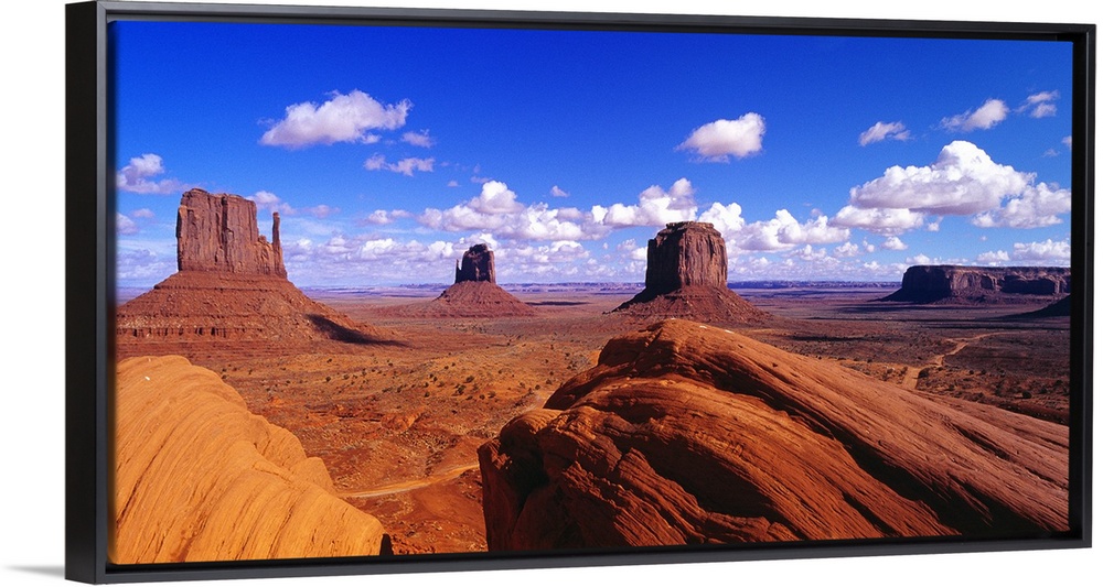 <p>Large panoramic photograph taken of Monument Valley with giant rock formations seen in the distance under a beautiful blue and clouded sky.</p>