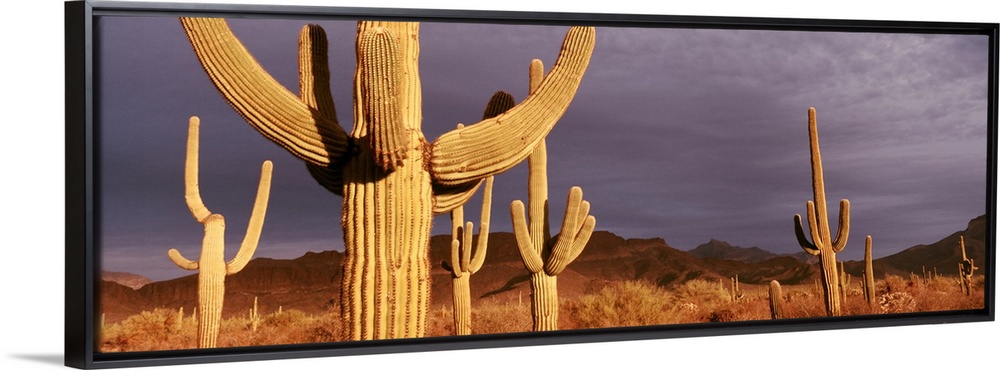 <p>Several desert cacti in a dry brush field at dusk at Organ Pipe National Monument in Arizona.</p>