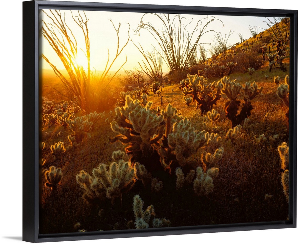 <p>Giant photograph focuses on a field of cactus plants sitting on a hill within the dry wilderness of the Southwestern United States. The gentle glow of the sun can be seen shining over the quiet landscape.</p>