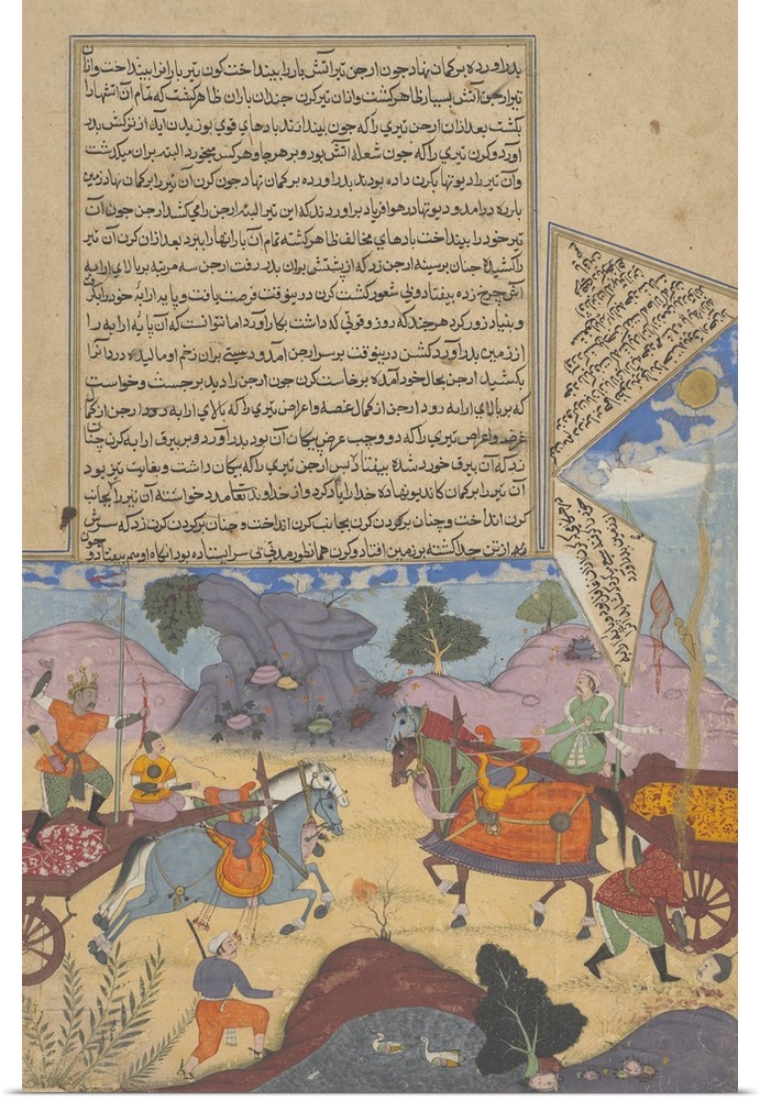 <p>Arjuna Slays Karna, page from a copy of the Razmnama, Mughal period, dated 1616-17, opaque watercolor and gold on paper.</p>