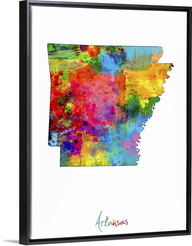 <p>Contemporary artwork of a map of Arkansas made of colorful paint splashes.</p>