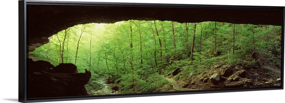 <p>Wide angle photograph of a bright green forest of trees and foliage, taken from the inside of Cobb Cave in the Lost Valley of the Ozarks, in Arkansas.</p>
