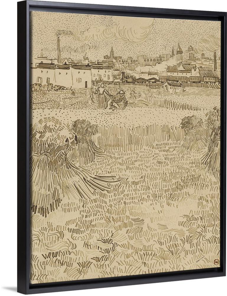 <p>Arles: View from the Wheatfields, by Vincent van Gogh, 1888, Dutch drawing, pen and brown ink on paper. Farmers work in a field in the city of Arles. In the vertical composition, the drawing marks as well as the drawing marks grow smaller and denser as th (BSLOC_2016_6_35)</p>