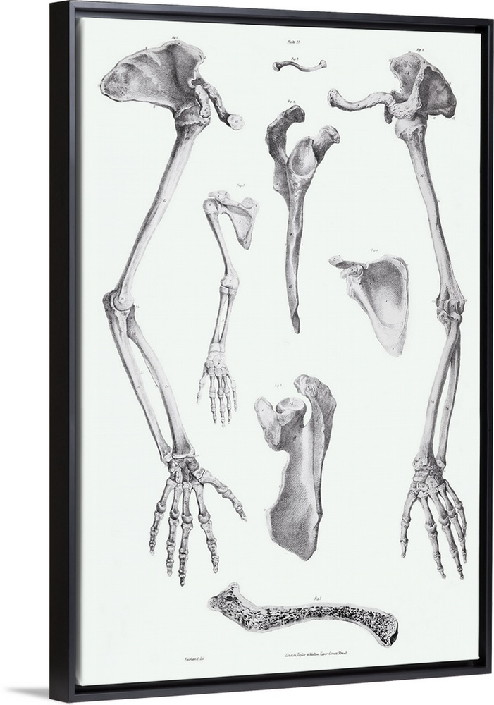 <p>Arm bones. Historical anatomical artwork of the bones of the human arm. At left and right, a left- hand arm, hand, and shoulder joint, are seen from the front and rear respectively. A section through a clavicle (collar bone) is at bottom, showing the honeycombed structure inside bones. Two artworks (upper and lower centre) show a right-hand scapula (shoulder blade) from the side (upper) and above (lower). In both cases, the hollow socket is where the ball of the upper arm bone (humerus) fits. The other three artworks are foetal bones (clockwise from top): a clavicle, a scapula and a full arm. Artwork from The Bones and Ligaments of the Human Body (Ed. Jones Quain, 1842).</p>