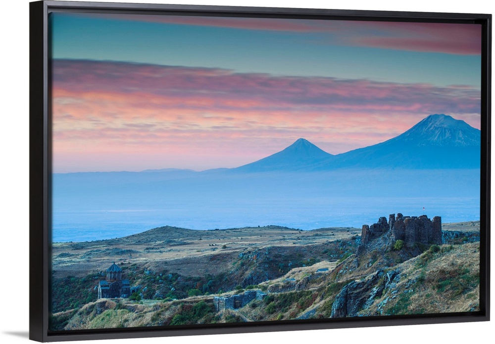 <p>Armenia, Aragatsotn, Yerevan, Amberd fortress located on the slopes of Mount Aragats, with Mount Ararat in the distance</p>