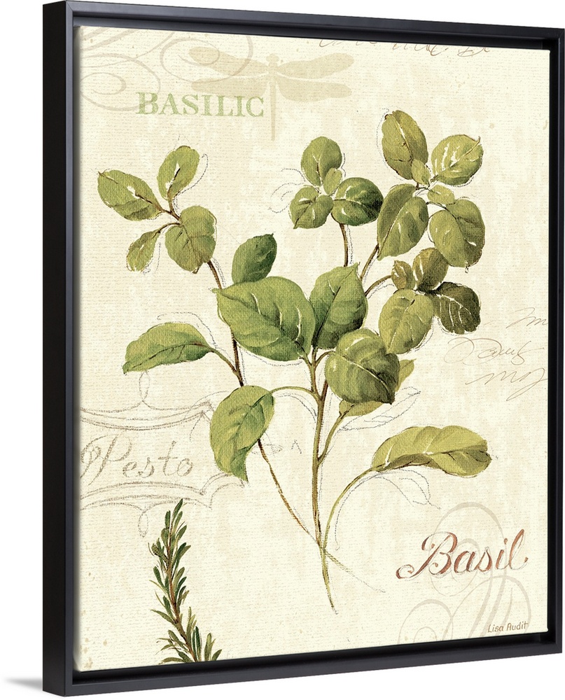 <p>Watercolor print of a few sprigs of a basil herb on a background decorated with text and flourishes.</p>