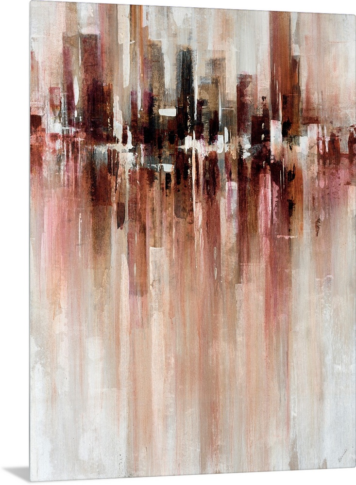 <p>Giant abstract art includes a mostly neutral toned background incorporating a horizontal section towards the top of the canvas art that has vertical rectangular shapes of a dark earth tone. The numerous earth toned rectangles towards the top of this piece stretch the entire horizontal space of this canvas art and are placed right next to each other.</p>