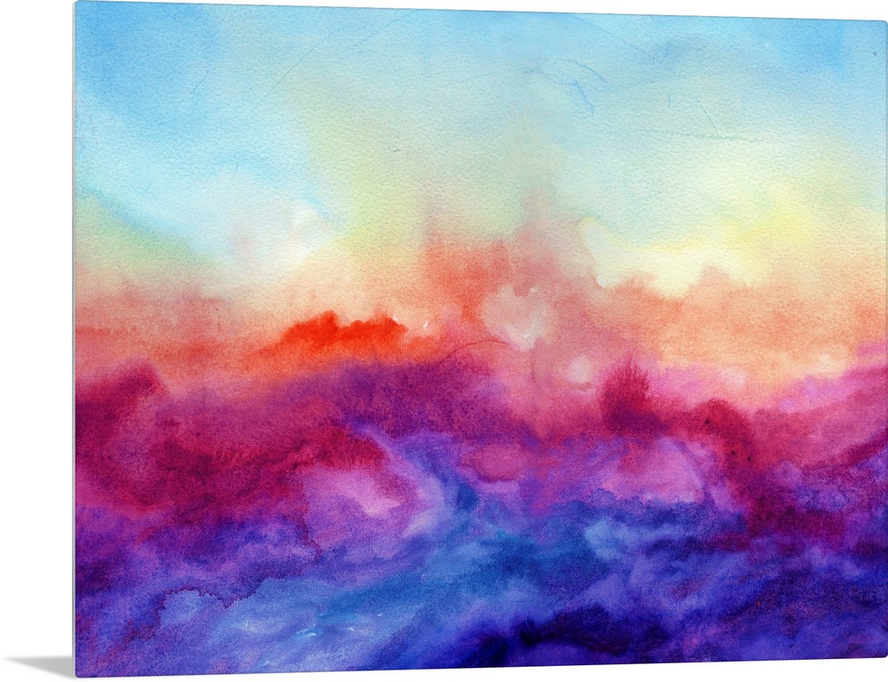 <p>A horizontal abstract watercolor painting in brilliant colors of purple, red and blue.</p>