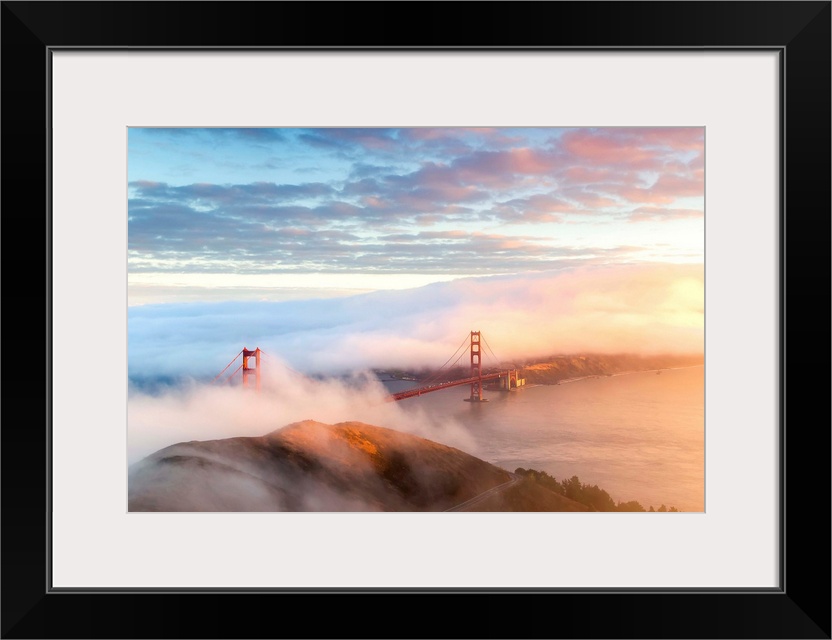 <p>Aerial view of the Golden Gate Bridge surrounded by fog with the sunset coming in from the right.</p>