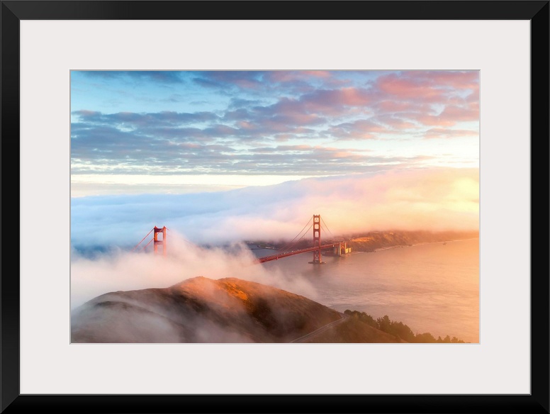 <p>Aerial view of the Golden Gate Bridge surrounded by fog with the sunset coming in from the right.</p>