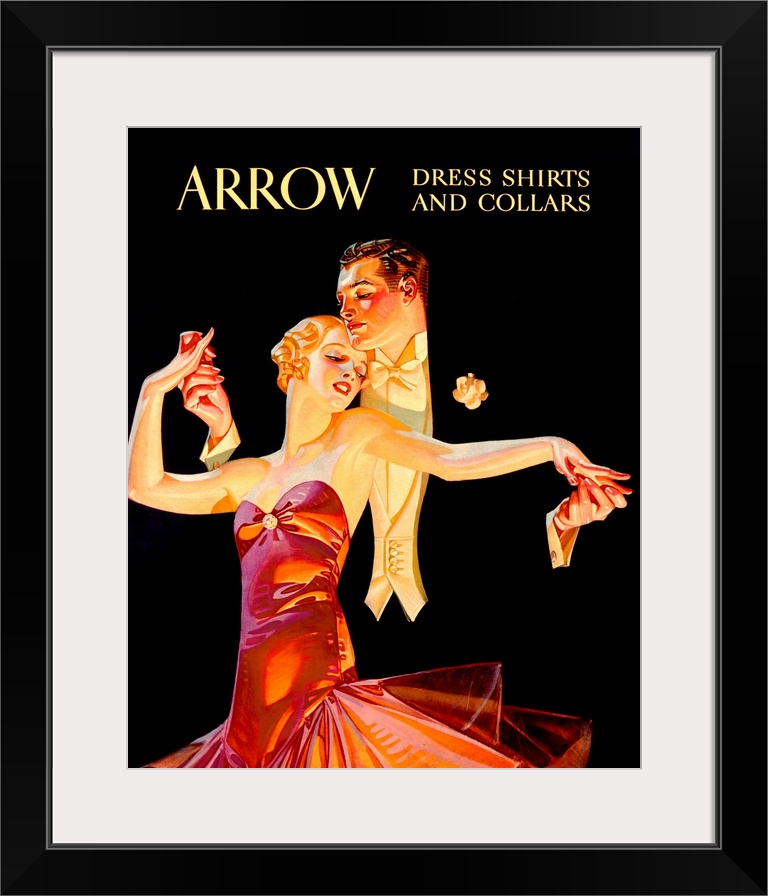 <p>Dancing couple in their evening wear. For Arrow Shirts, probably his leading client after the Saturday Evening Post Leyendecker created a world of wealthy WASPs--college men, sportsmen, society dandies--all looking made of something midway between marble and mortal flesh, and right out of F. Scott Fitzgerald. \ Indeed, they became so much the standard for American male looks that we might more correctly say Fitzgeralds characters are out of Leyendecker: In his 1929 story, The Last of the Belles, a man with a handsome, earnest face (and) a Leyendecker forelock is the type the heroine hopes to marry. For all we know, her vision of a happy ending could have come from this very Arrow poster.</p>