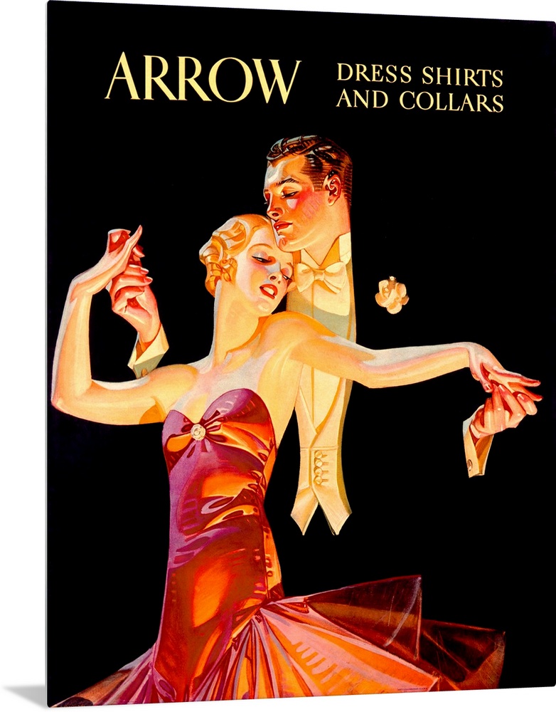 <p>Dancing couple in their evening wear. For Arrow Shirts, probably his leading client after the Saturday Evening Post Leyendecker created a world of wealthy WASPs--college men, sportsmen, society dandies--all looking made of something midway between marble and mortal flesh, and right out of F. Scott Fitzgerald. \ Indeed, they became so much the standard for American male looks that we might more correctly say Fitzgeralds characters are out of Leyendecker: In his 1929 story, The Last of the Belles, a man with a handsome, earnest face (and) a Leyendecker forelock is the type the heroine hopes to marry. For all we know, her vision of a happy ending could have come from this very Arrow poster.</p>