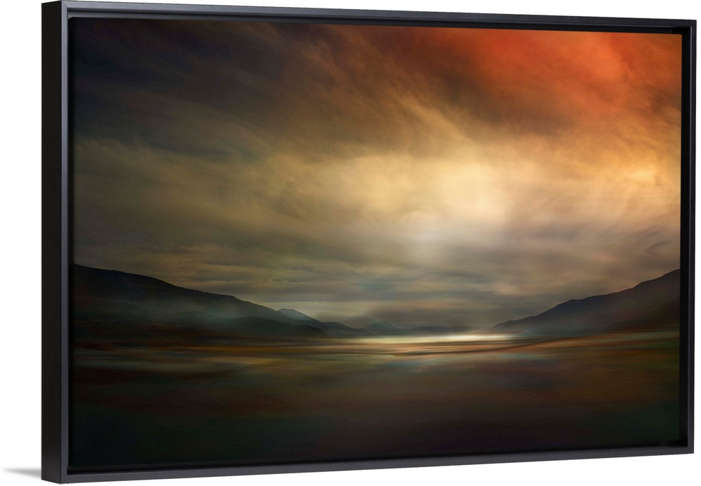 <p>Fine art photo of a valley dimly lit by glowing clouds at sunset in Canada.</p>