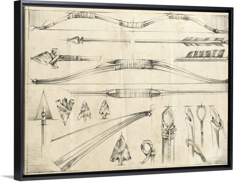<p>Detailed pencil illustration of several arrows, bows, and arrowheads.</p>