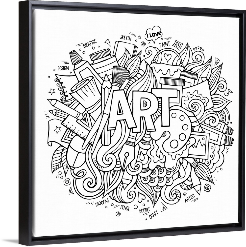 <p>A collection of art supplies such as brushes and pens surrounding the word "Art." Perfect for Coloring canvas.</p>
