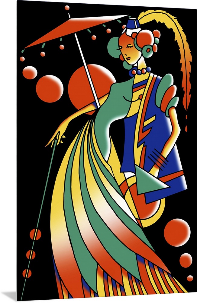 <p>Digital artwork of a woman in fancy dress, in Art Deco style.</p>
