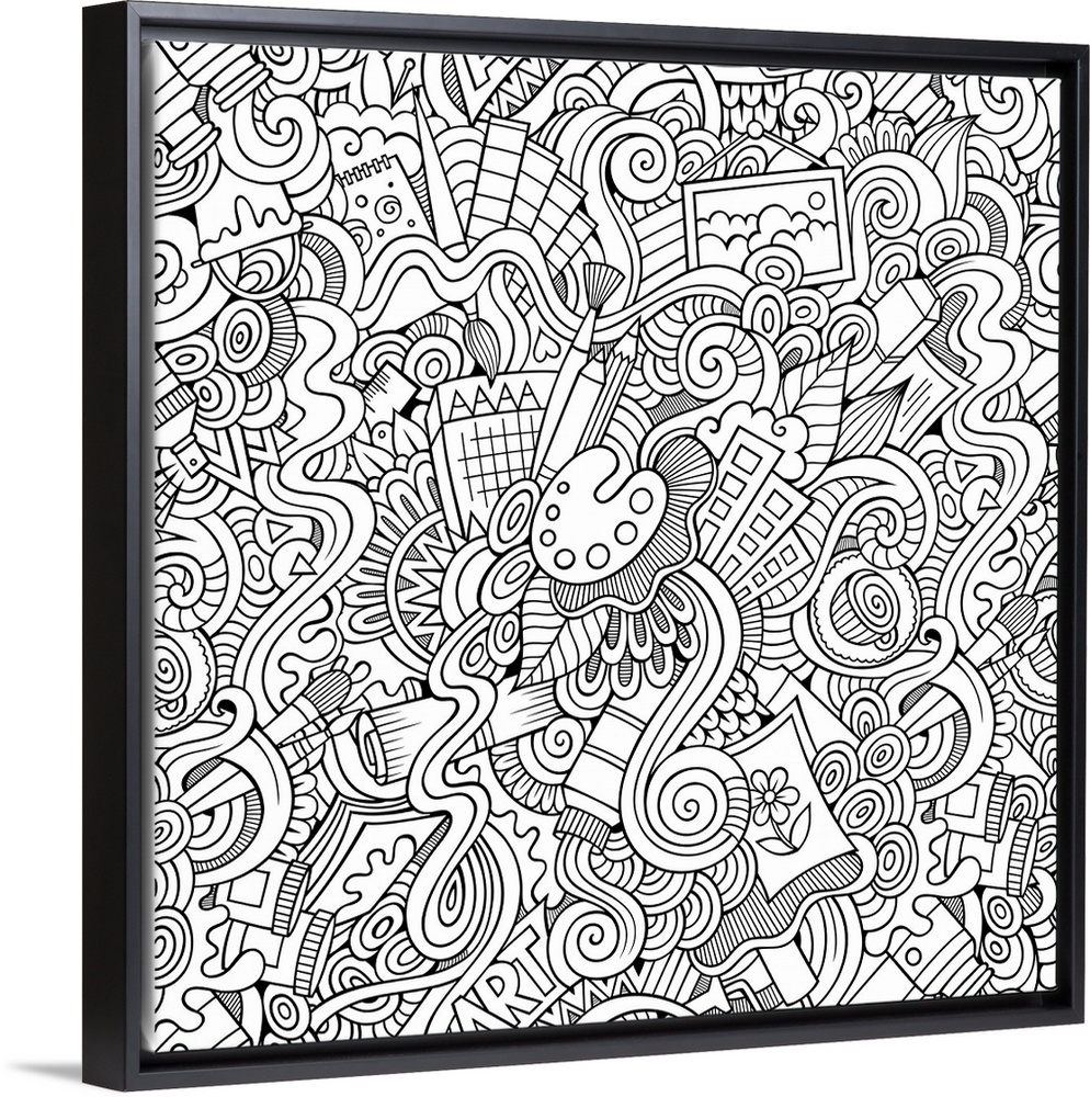 <p>An assortment of swirls and art supplies such as paint brushes and pencils. Perfect for Coloring Canvas.</p>
