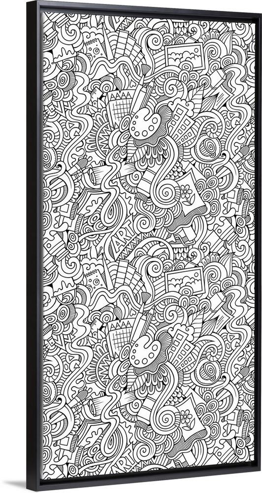 <p>An assortment of swirls and art supplies such as paint brushes and pencils.</p>