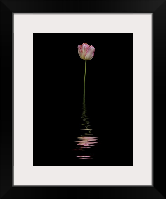 <p>Art image of a pink and white tulip reflected in water.</p>