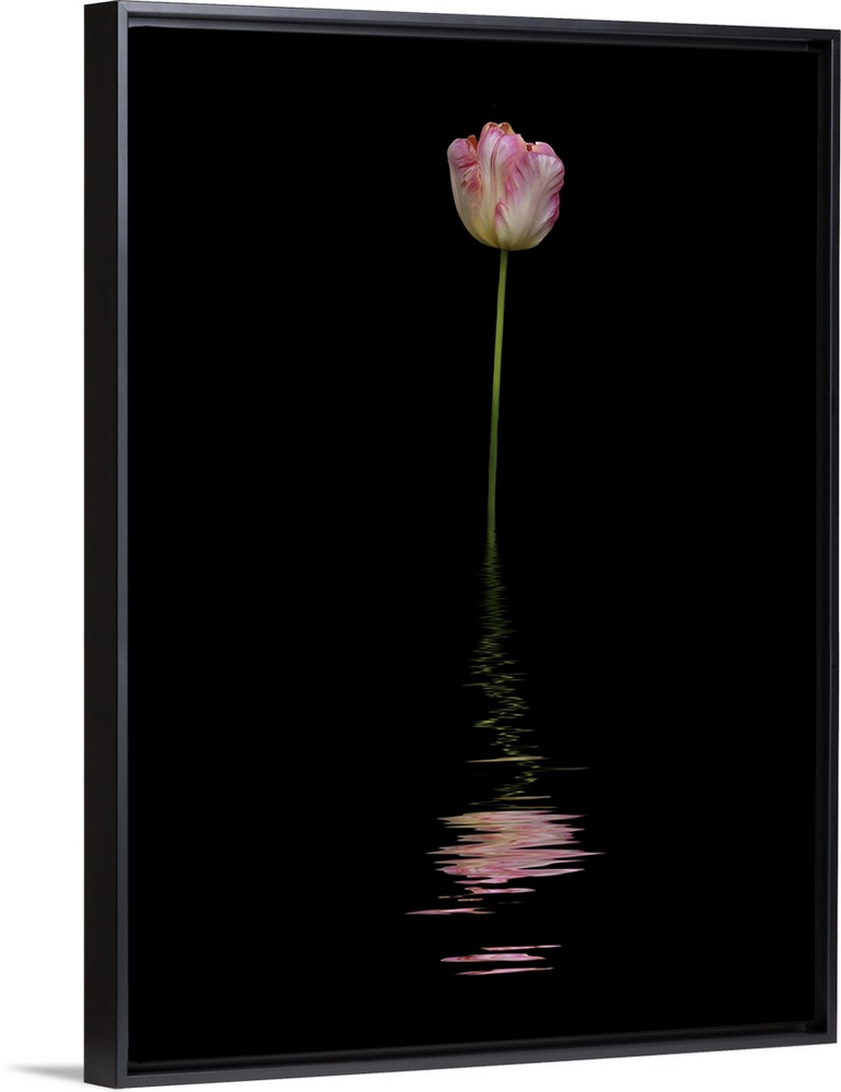 <p>Art image of a pink and white tulip reflected in water.</p>