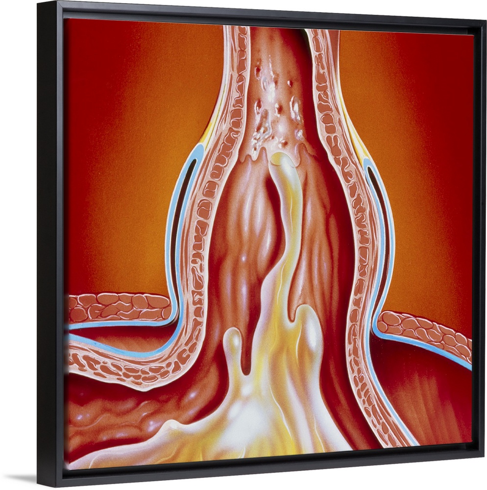 <p>Hiatus hernia. Illustration of a hiatus hernia, showing gastro-oesophageal reflux. Here, the junction between the oesophagus (at top) and the stomach (bottom) is seen. The diaphragm is the red structure running diagonally from lower left to right. Hiatus hernia is the condition in which the stomach protrudes through the diaphragm into the chest cavity. This results in the contents of the stomach (acidic gastric juices, yellow) passing abnormally back up the oesophagus. It is known as gastro-oesophageal reflux. Reflux may cause heart- burn and inflammation of the oesophagus. Treatment involves avoiding large meals, stopping smoking, weight loss, and the use of antacid drugs.</p>