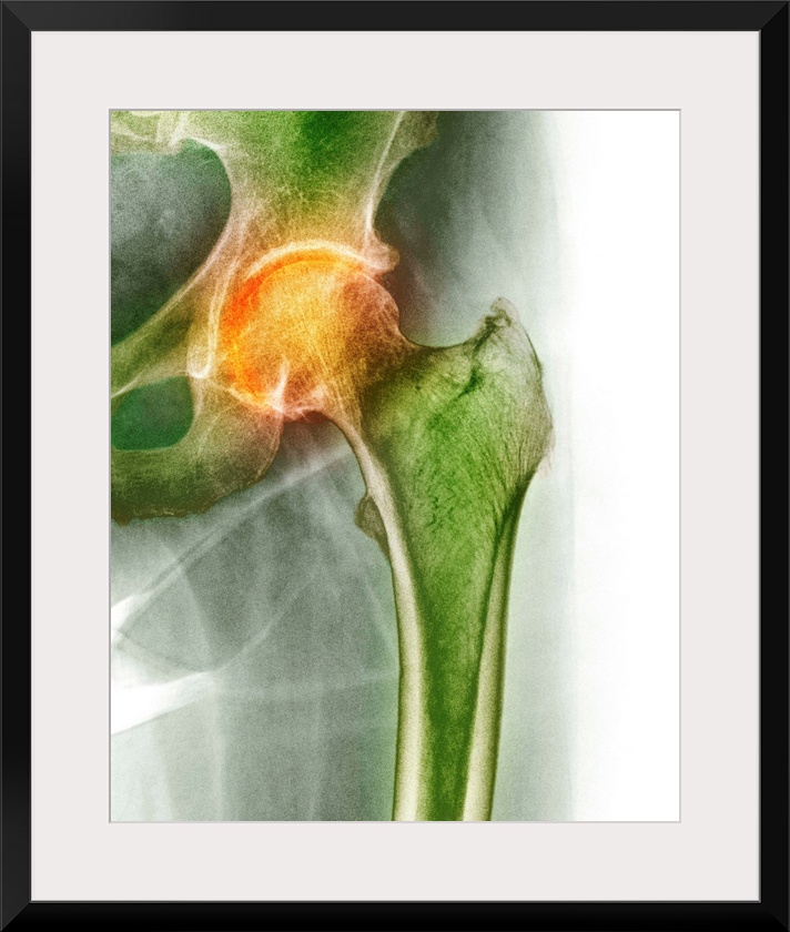 <p>Arthritis of the hip. Coloured X-ray of an arthritic hip.</p>