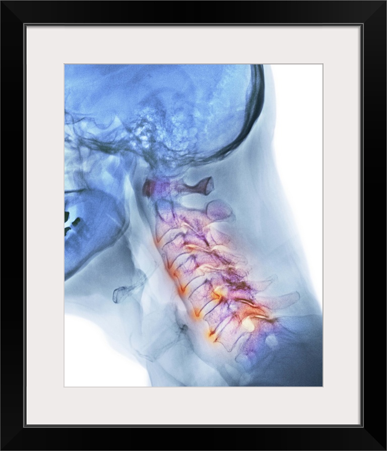 <p>Arthritis of the neck. Coloured X-ray of the arthritic cervical spine of a 70 year old man.</p>