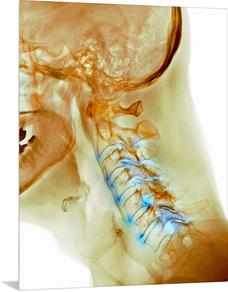 <p>Arthritis of the neck. Coloured X-ray of the arthritic cervical spine of a 70 year old man.</p>