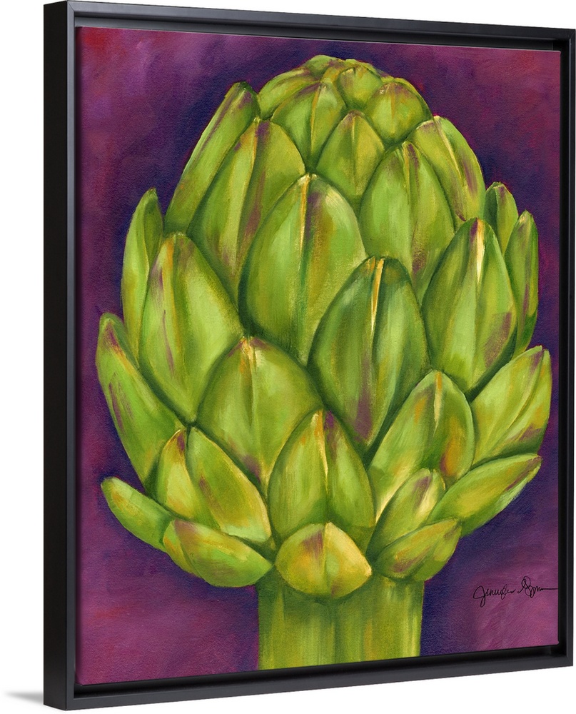 <p>Artwork perfect for the kitchen that is a drawing of an artichoke against a purple background.</p>