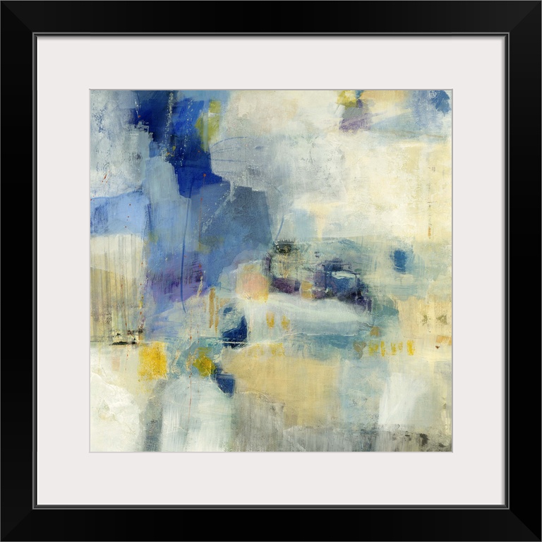 <p>Contemporary abstract painting using splashes of blue and yellow against a beige background.</p>