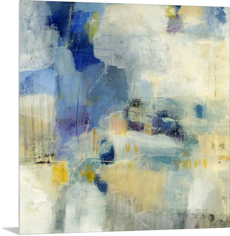 <p>Contemporary abstract painting using splashes of blue and yellow against a beige background.</p>
