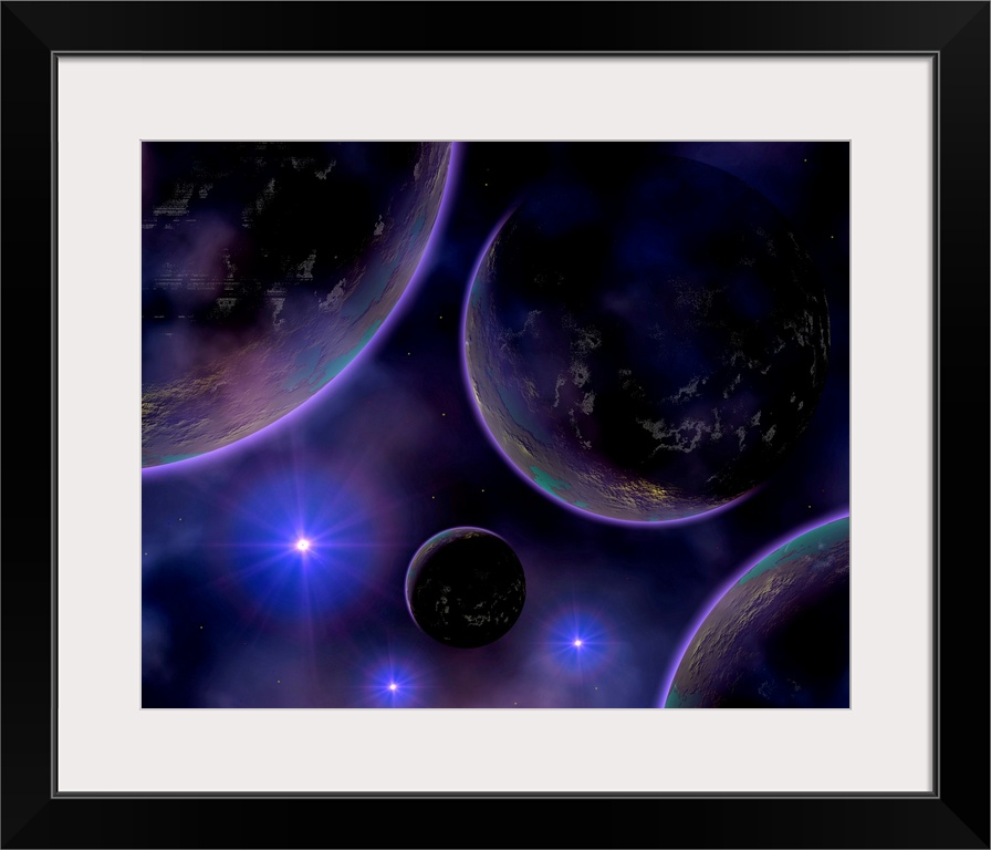 <p>Artist's concept illustrating a cluster of blue stars on the edge of a nebula, which is their birth place, along with a group of planets which are home to various alien life forms. Blue stars are the youngest of star types, and so their planets must also be comparatively young as well.</p>