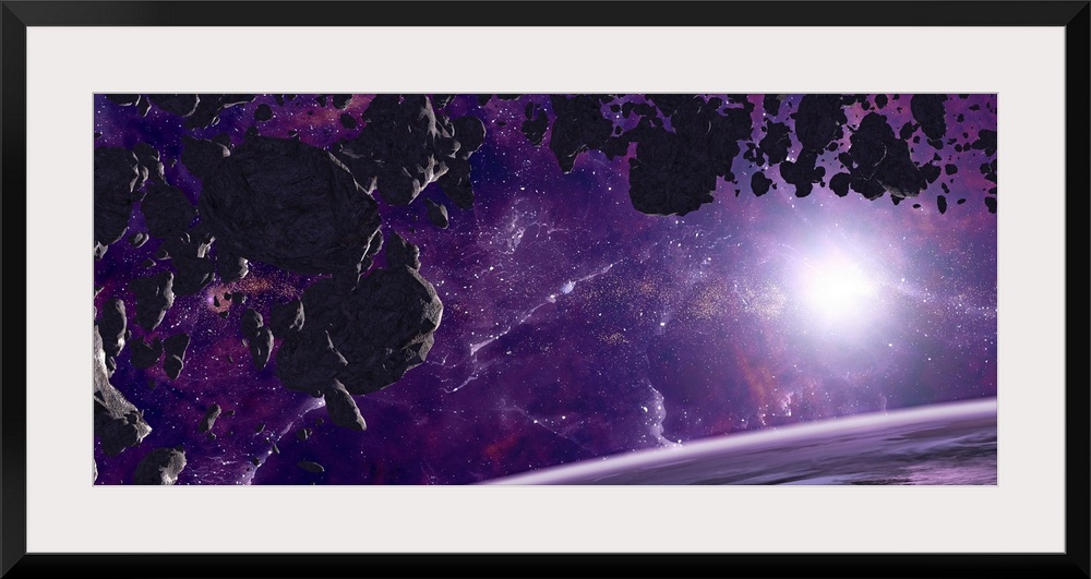 <p>Asteroid field with orbits hot and starry/nebula background Artist's concept of an asteroid field against a celestial background.</p>