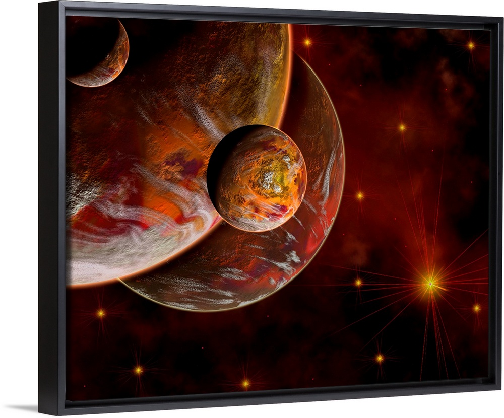 <p>A conceptual image where the stars are red along with the planets and nearby nebula, which is the birth place of these star systems.</p>