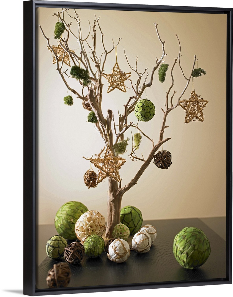 <p>Artwork composed from dried tree branch and paper ornaments</p>