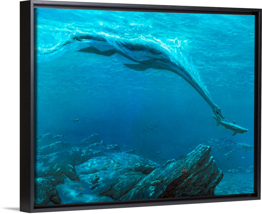 <p>Plesiosaur dinosaur. Artwork of a long-necked marine dinosaur (plesiosaur) hunting a shark in a shallow sea. Plesiosaurs (\ribbon reptiles\) had a relatively small head with a mouth lined with teeth. It was probably a fish-eater, using its neck to throw its head forward at prey. It was propelled through the water by four powerful paddle-like limbs which it flapped up and down like the paddles of a modern-day turtle. Plesiosaurs probably came ashore to lay their eggs. Dinosaurs lived during the Mesozoic era (65-225 million years ago).</p>