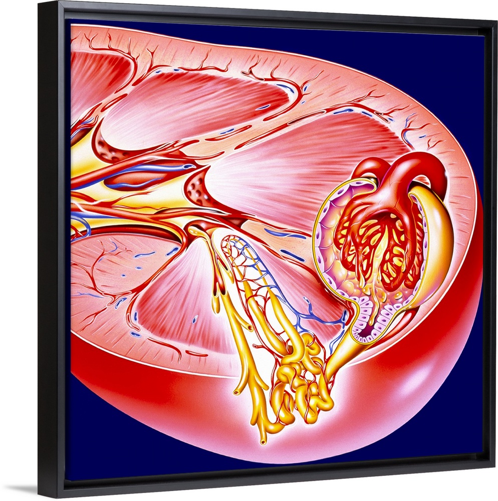 <p>Kidney. Artwork of a section through a human kidney. The two kidneys excrete urine and regulate blood and electrolyte balance. One of the million nephrons contained in each kidney is magnified at centre right. Fluid is filtered from the blood of the arteriole (red) by the mesh-like glomerulus of the Bowman's capsule (yellow). The fluid collects in the tubule (yellow) below. Nearly all water and salts are reabsorbed from the tubule and its straight section, the loop of Henle (at centre), to form urine. Urine then runs through one of the calyces (at far left) and into the ureter (not seen). The kidney consists of outer cortex (light pink) and inner medulla (dark pink).</p>