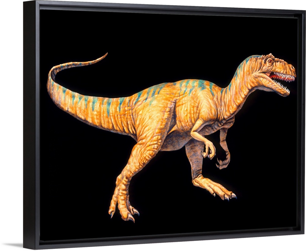 <p>Allosaurus dinosaur. Artwork of an Allosaurus dinosaur (Allosaurus sp.). Allosaurs were large predatory dinosaurs during the Jurassic and Cretaceous periods, between 65 and 200 million years ago. Allosaurs reached around 11 metres in length and two tonnes in weight. They were characterised by powerful hindlimbs and short forelimbs, both with three claws, and by teeth with serrated edges. Their powerful, muscular tail was used for balancing purposes. Opinion differs as to whether these large carnivores hunted alone or in packs.</p>